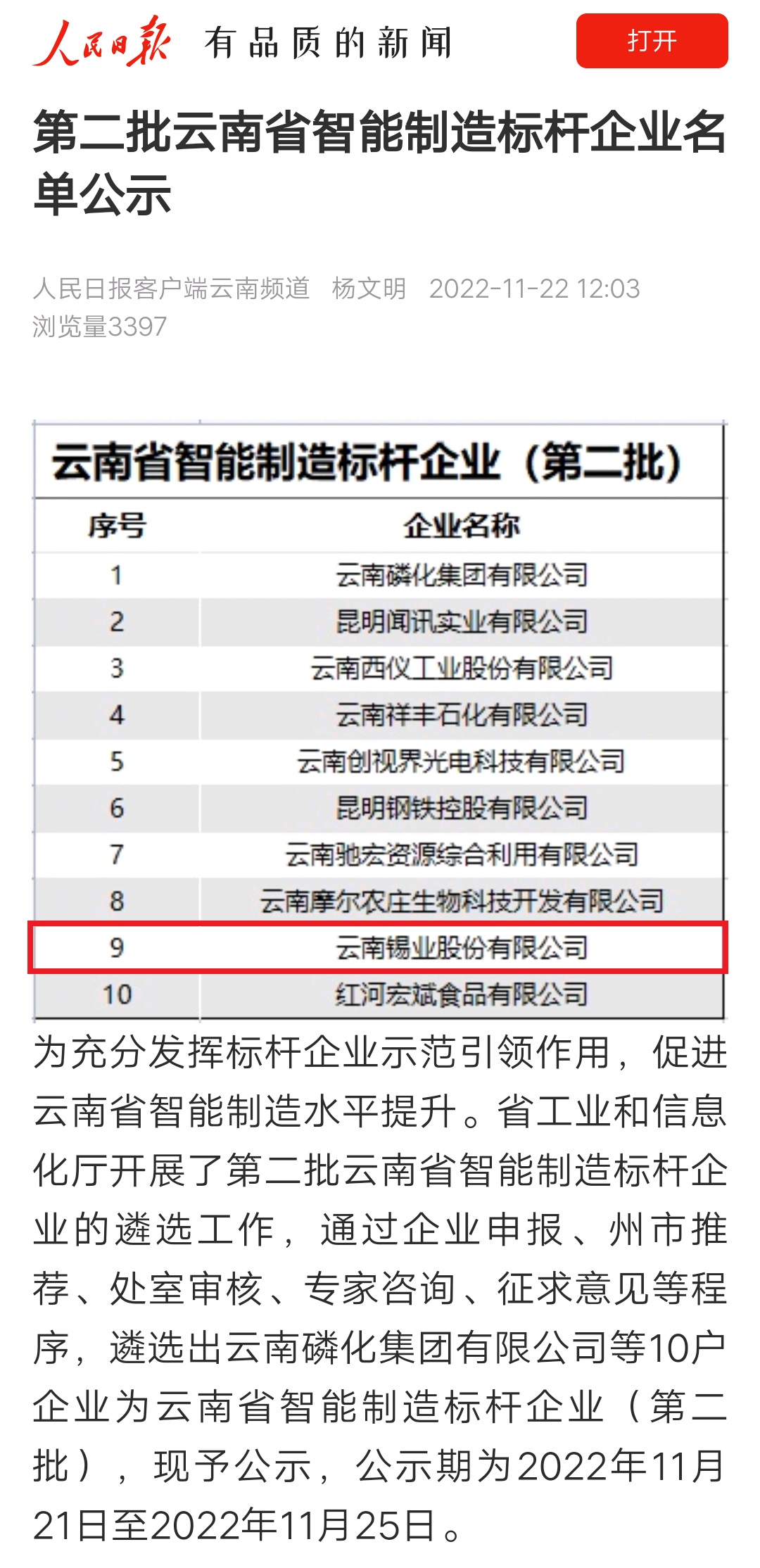 人民日報客戶端:錫業股份上榜第二批云南省智能制造標桿企業名單
